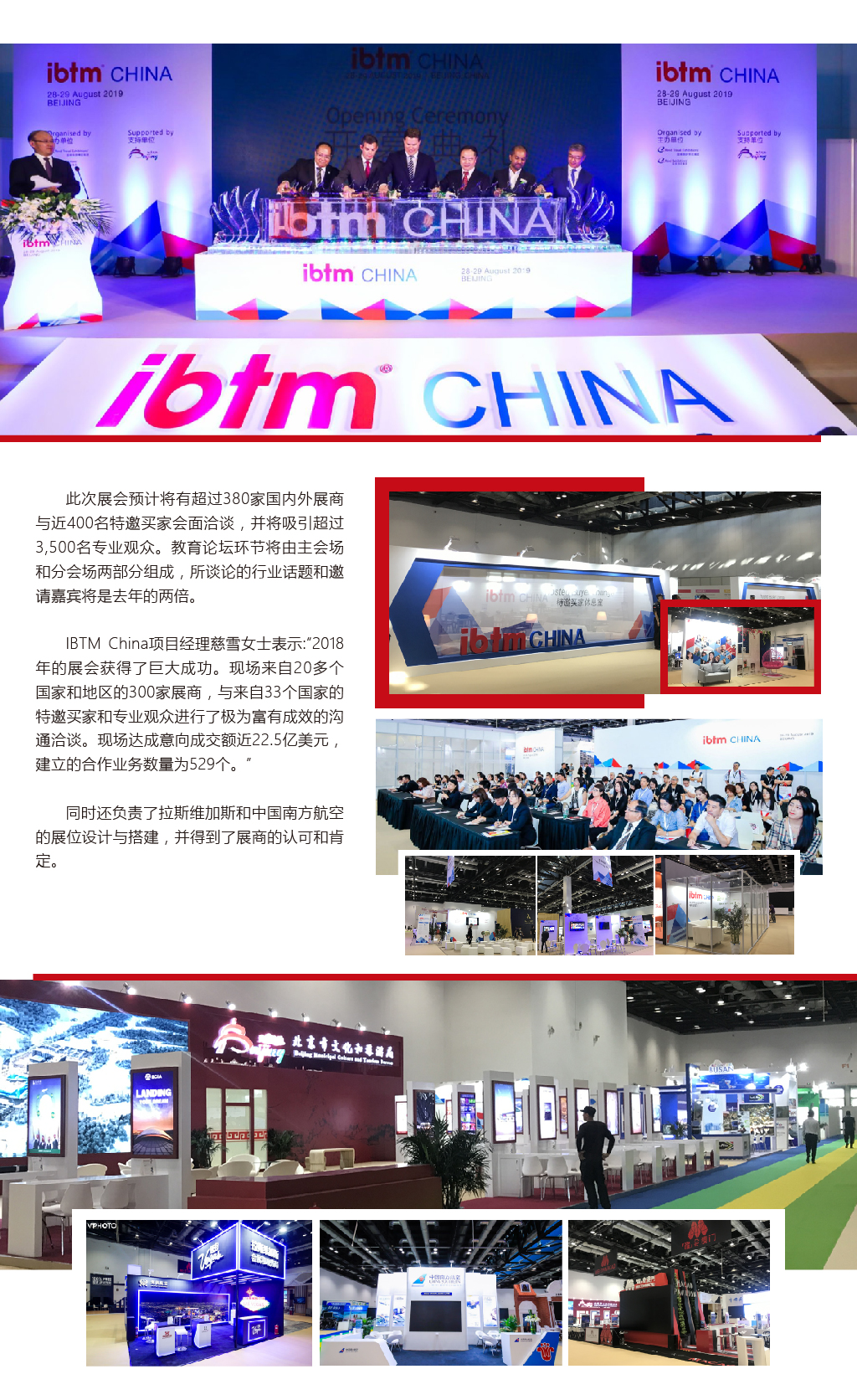 IBTM China作為勵(lì)展旅游展覽集團(tuán)旗下ibtm®系列展覽的中國(guó)站 -- 首次披露其2019年展會(huì)具體信息。主辦方明年將增大國(guó)內(nèi)二三線城市和亞太區(qū)域內(nèi)特邀買(mǎi)家的邀請(qǐng)比例。引進(jìn)“Happy Hour”環(huán)節(jié)并增設(shè)“互動(dòng)體驗(yàn)區(qū)”,增強(qiáng)展商和特邀買(mǎi)家的現(xiàn)場(chǎng)多維互動(dòng),力圖通過(guò)創(chuàng)造一系列全新社交活動(dòng)以促進(jìn)展商和買(mǎi)家建立有效的商務(wù)合作。盛典公司為本次展會(huì)提供了主場(chǎng)運(yùn)營(yíng)及主場(chǎng)搭建服務(wù),同時(shí)負(fù)責(zé)拉斯維加斯會(huì)展和觀光局、海南航空展臺(tái)的搭建,獲得了展商及主辦方的認(rèn)可。